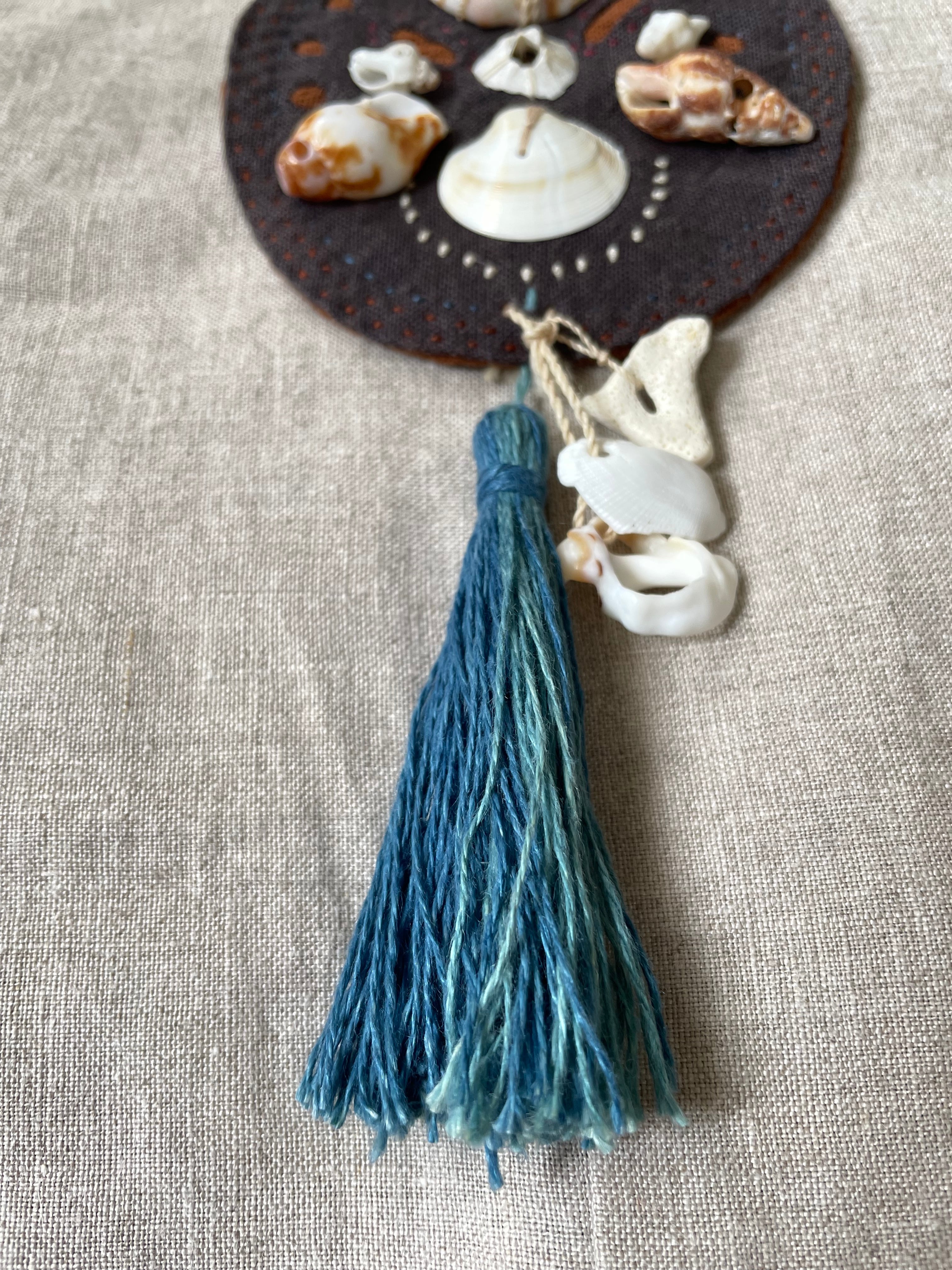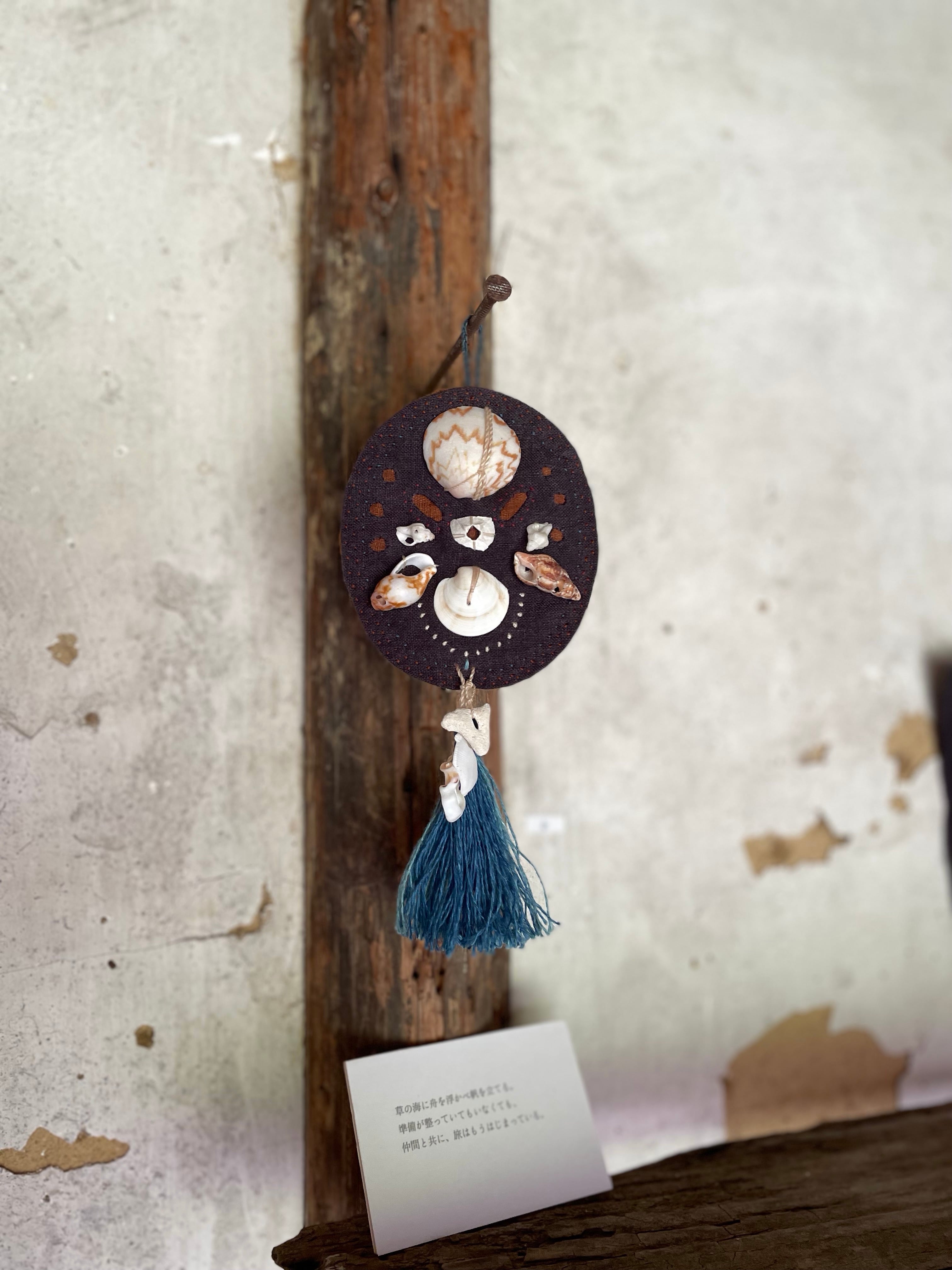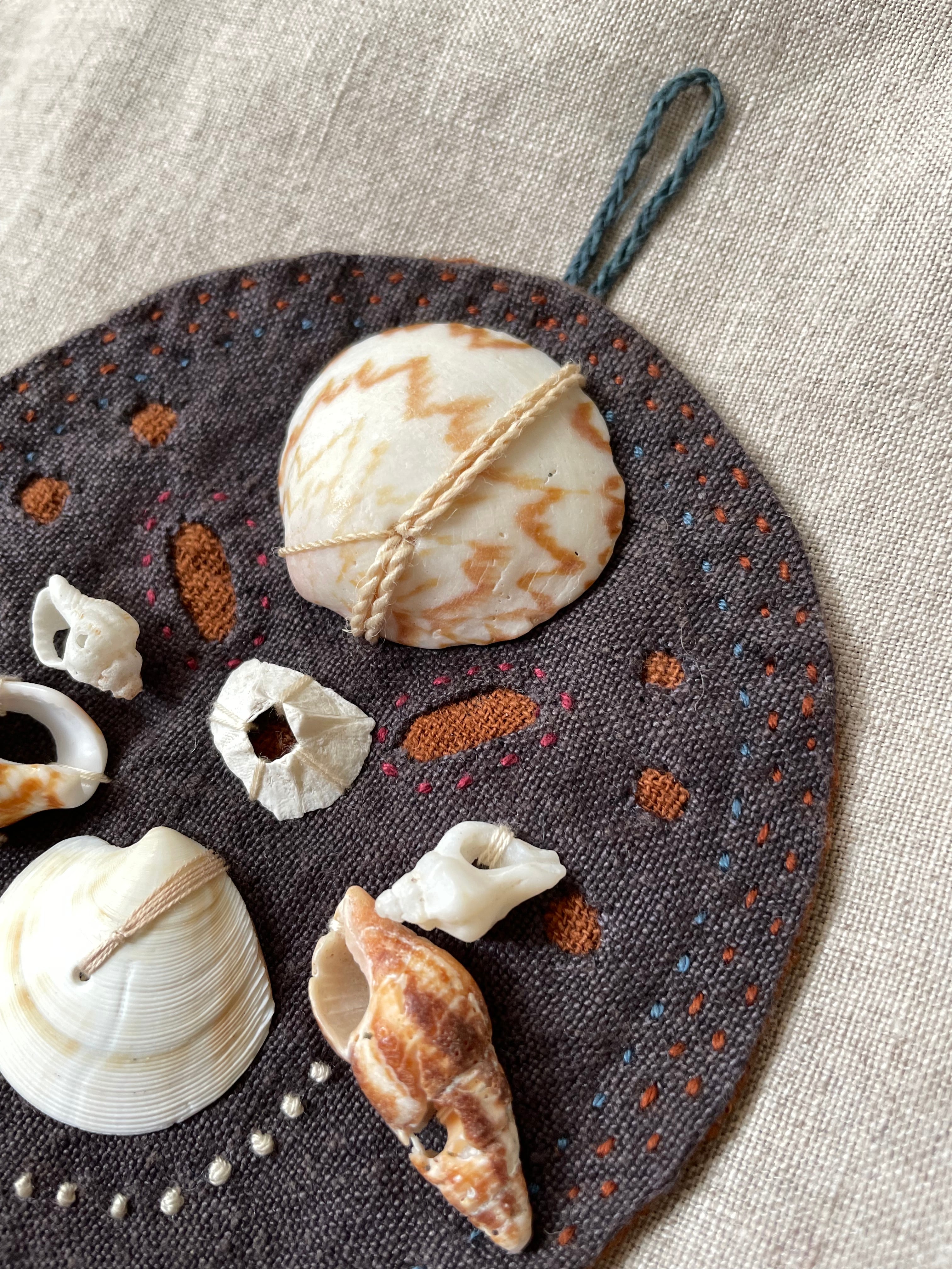 美しい色柄の貝殻を生地に留めてオブジェにしました。