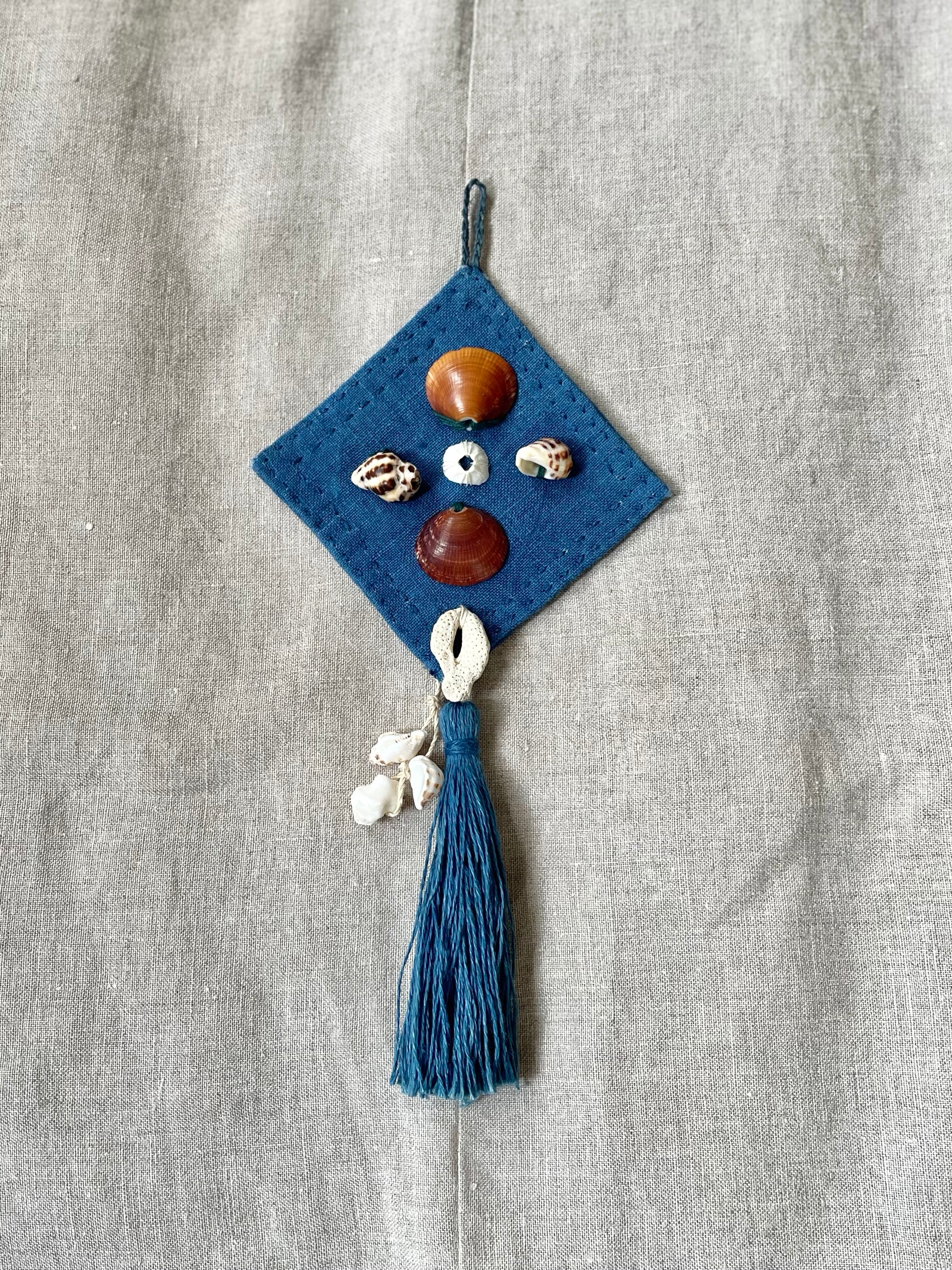 美しい色柄の貝殻を生地に留めてオブジェにしました。